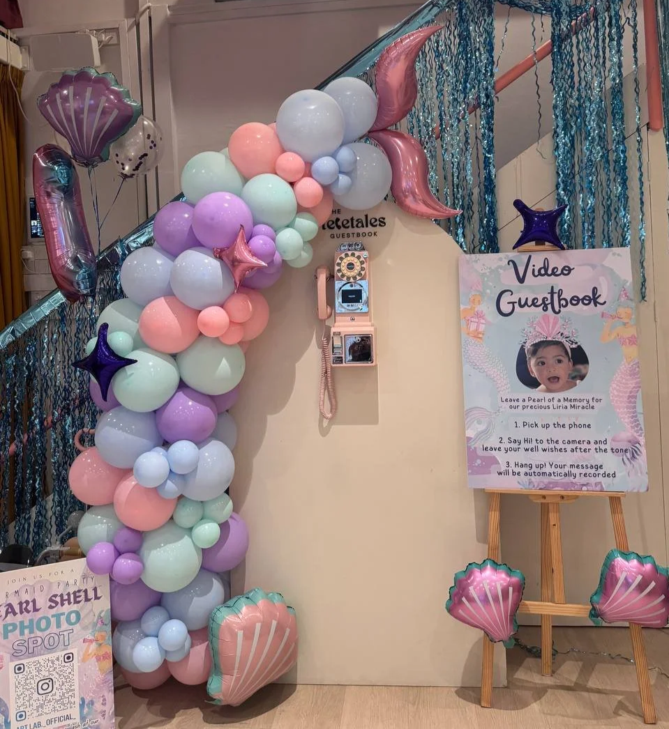 A video guestbook station at an outdoor event. It has a sign with instructions, a vintage video guestbook phone for recording messages, and a floral arrangement at the base.