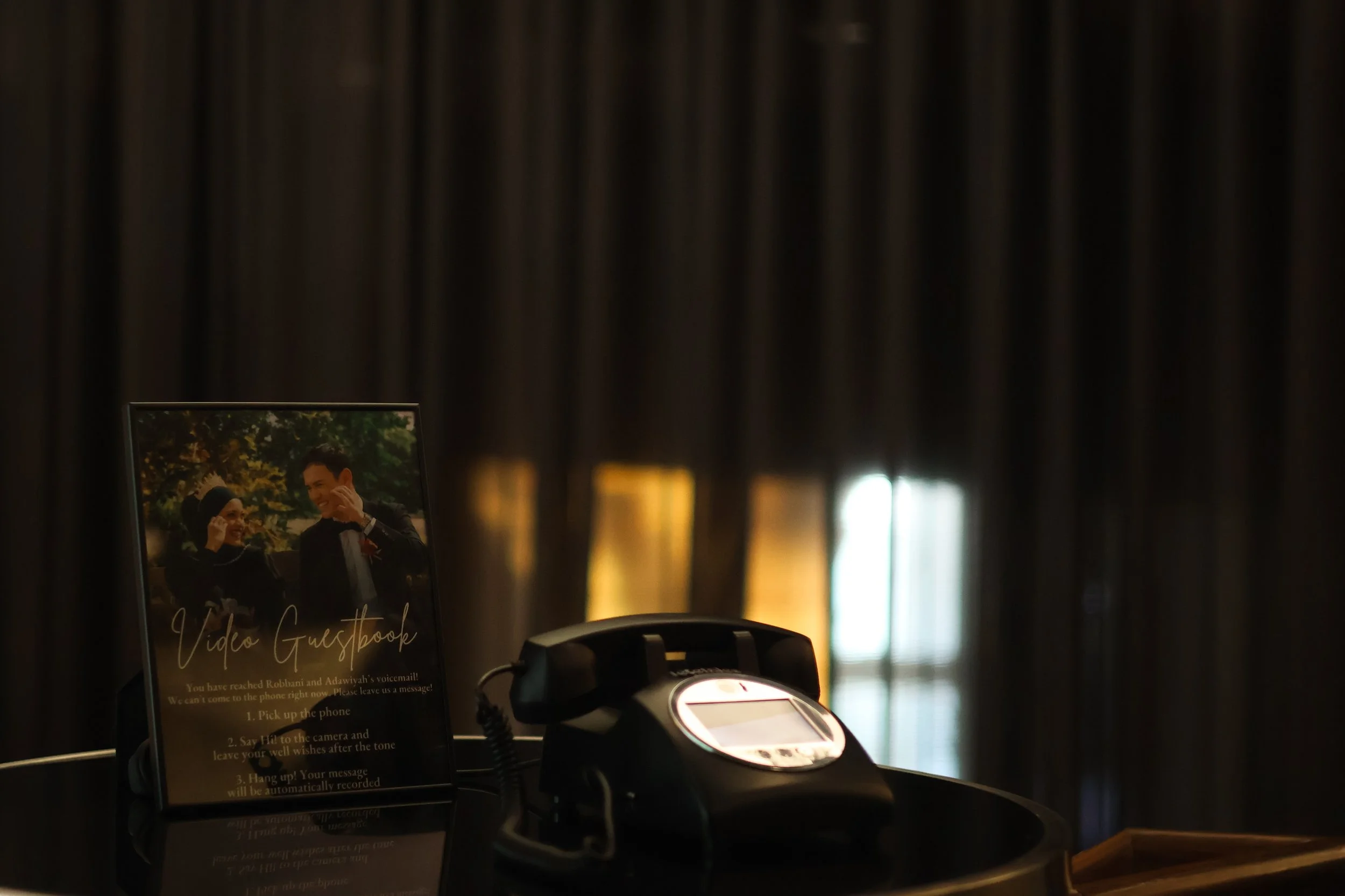 A white table with a floral arrangement, a picture frame, and a telephone, set up for a video guestbook guestbook signing at an event.
